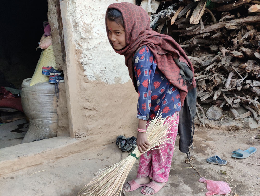 Selv må Dhirja arbejde 8 timer om dagen med at passe hus, kvæg og sine små søskende.